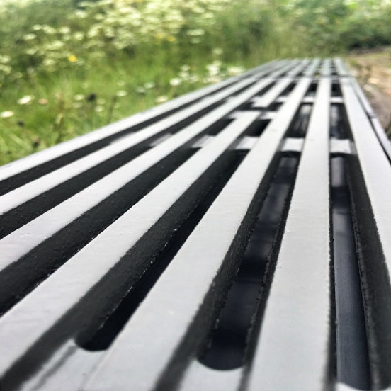 We took the vertical lines of a traditional slotted grate and turned them sideways, giving our Que pattern a long, lean look with eye-catching depth and dimension.
